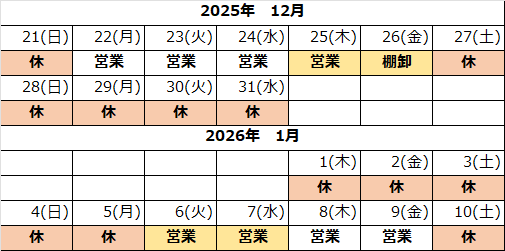 2025年12月27日(土)~2026年1月5日(月)年末年始休業